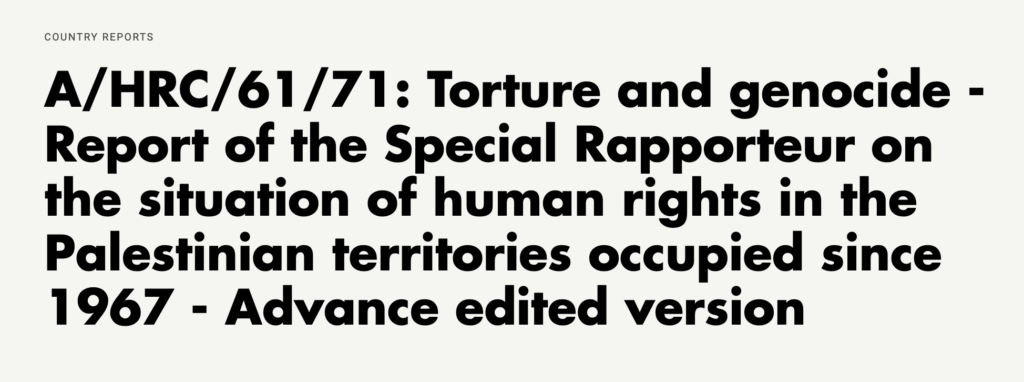 Francesca Albanese, FN:s särskilda representant för situationen för mänskliga rättigheter i det ockuperade palestinska området, har publicerat en ny rapport, Torture and genocide.